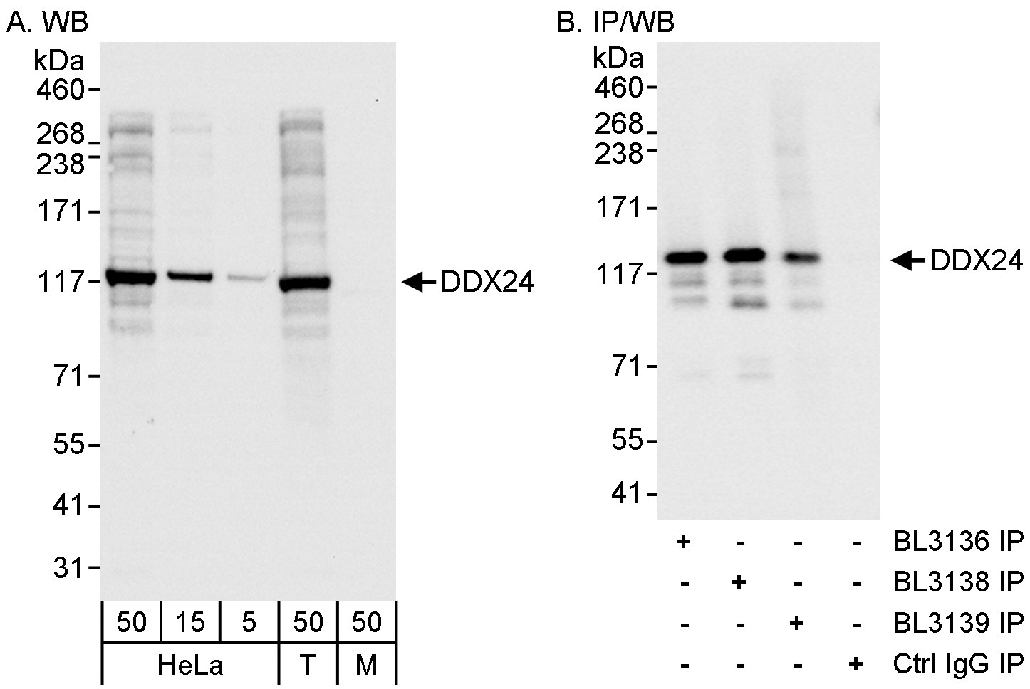 Immunogen: synthetic peptide. The epitope recognized by A300-698A-T maps to a region between residue 800 and the C-terminus (residue 859) of human DEAD (Asp-Glu-Ala-Asp) box polypeptide 24 using the numbering given in entry NP_065147.1 (GeneID 57062).