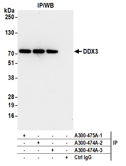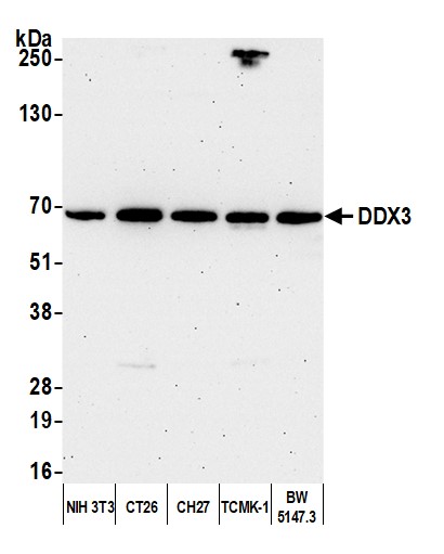| Immunogen: | synthetic peptide. The epitope recognized by A300-474A-T maps to a region between residues 1 and 50 of human DEAD (Asp-Glu-Ala-Asp) box polypeptide 3 using the numbering given in entry NP_001347.2 (GeneID 1654). |