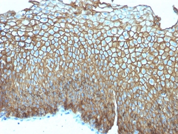0.2 mg/ml with 0.1 mg/ml BSA (US sourced), 0.05% sodium azide. Recognizes a protein of 130kDa, identified as Desmoglein-3 (DSG3). This MAb is highly specific to Desmoglein-3 and does not cross-react with other members of the Desmoglein-family. DSG3 is a calcium-binding transmembrane glycoprotein component of desmosomes in vertebrate epithelial cells. Research has shown that DSG3 has a very high sensitivity (80%) and specificity (100%) in recognizing squamous cell carcinoma (SqCC). Therefore, DSG3 is considered a very important marker for lung SqCC and can be a useful ancillary marker to separate SqCC from other subtypes of lung cancer. Moreover, studies have shown that DSG3 expression in lung SqCC may indicate a poor prognosis. Protein function: Component of intercellular desmosome junctions. Involved in the interaction of plaque proteins and intermediate filaments mediating cell-cell adhesion. [The UniProt Consortium]