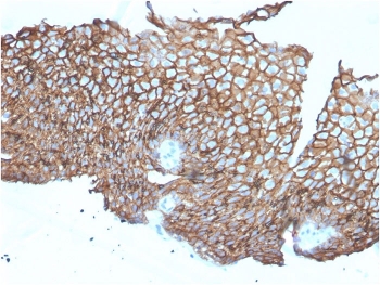0.2 mg/ml with 0.1 mg/ml BSA (US sourced), 0.05% sodium azide. Recognizes a protein of 130kDa, identified as Desmoglein-3 (DSG3). This MAb is highly specific to Desmoglein-3 and does not cross-react with other members of the Desmoglein-family. DSG3 is a calcium-binding transmembrane glycoprotein component of desmosomes in vertebrate epithelial cells. Research has shown that DSG3 has a very high sensitivity (80%) and specificity (100%) in recognizing squamous cell carcinoma (SqCC). Therefore, DSG3 is considered a very important marker for lung SqCC and can be a useful ancillary marker to separate SqCC from other subtypes of lung cancer. Moreover, studies have shown that DSG3 expression in lung SqCC may indicate a poor prognosis. Protein function: Component of intercellular desmosome junctions. Involved in the interaction of plaque proteins and intermediate filaments mediating cell-cell adhesion. [The UniProt Consortium]