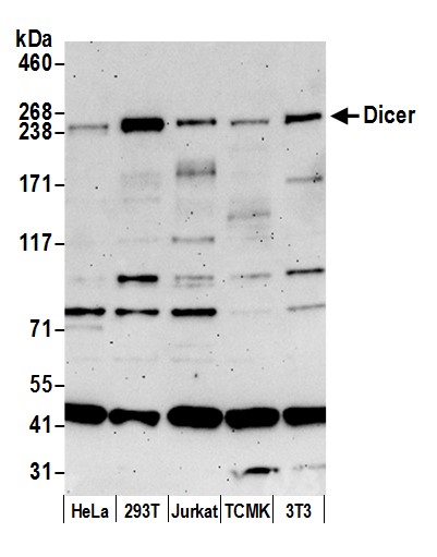 | Immunogen: | synthetic peptide. The epitope recognized by A301-936A-T maps to a region between residue 600 and 650 of human double-stranded RNA-specific endoribonuclease, dicer1 using the numbering given in entry NP_085124.2 (GeneID 23405). |