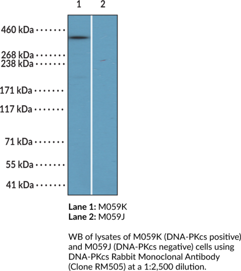 DNA-dependent protein kinase catalytic subunit (DNA-PKcs) is a member of the PI3K-related kinase (PIKK) family. It is composed of an N-terminal domain, which consists of two domains of HEAT repeats, a FAT homology domain, a FKBP12-rapamycin-binding (FRB) domain, a kinase domain, a PIKK regulatory domain, and a C-terminal FAT domain (FATC). DNA-PKcs localizes to the nucleus, cytoplasm, plasma membrane, cytoskeleton, and lipid rafts. It is involved in DNA double-strand break (DSB) repair through non-homologous end-joining (NHEJ) and homologous recombination (HR) pathways and contains numerous phosphorylation sites that modify its activity, such as Ser2056, which must be autophosphorylated for NHEJ to occur in response to DSBs. DNA-PKcs also plays a role in mitosis, telomere maintenance, transcriptional regulation, innate and adaptive immunity, and senescence, among many other processes. DNA-PKcs interacts with Ku70/Ku80 to form the DNA-PK holoenzyme, which acts on various substrates, including histone H2AX, heat shock protein 90 (Hsp90), and Artemis. High expression or increased activity of DNA-PKcs is associated with metastasis, poor prognosis, and radio- and chemoresistance in various cancers. Cayman's DNA-PKcs Rabbit Monoclonal Antibody (Clone RM505) can be used for immunohistochemistry (IHC) and Western blot (WB) applications.. Protein function: Serine/threonine-protein kinase that acts as a molecular sensor for DNA damage. Involved in DNA non-homologous end joining (NHEJ) required for double-strand break (DSB) repair and V(D)J recombination (PubMed:11955432, PubMed:12649176, PubMed:14734805). Must be bound to DNA to express its catalytic properties. Promotes processing of hairpin DNA structures in V(D)J recombination by activation of the hairpin endonuclease artemis (DCLRE1C) (PubMed:11955432). The assembly of the DNA-PK complex at DNA ends is also required for the NHEJ ligation step (PubMed:15574326, PubMed:11955432, PubMed:12649176, PubMed:14734805). Required to protect and align broken ends of DNA (PubMed:15574326, PubMed:11955432, PubMed:12649176, PubMed:14734805). May also act as a scaffold protein to aid the localization of DNA repair proteins to the site of damage (PubMed:15574326, PubMed:11955432, PubMed:12649176, PubMed:14734805). Found at the ends of chromosomes, suggesting a further role in the maintenance of telomeric stability and the prevention of chromosomal end fusion. Also involved in modulation of transcription (PubMed:15574326, PubMed:11955432, PubMed:12649176, PubMed:14734805). As part of the DNA-PK complex, involved in the early steps of ribosome assembly by promoting the processing of precursor rRNA into mature 18S rRNA in the small-subunit processome (PubMed:32103174). Binding to U3 small nucleolar RNA, recruits PRKDC and XRCC5/Ku86 to the small-subunit processome (PubMed:32103174). Recognizes the substrate consensus sequence [ST]-Q (PubMed:15574326, PubMed:11955432, PubMed:12649176, PubMed:14734805). Phosphorylates 'Ser-139' of histone variant H2AX, thereby regulating DNA damage response mechanism (PubMed:14627815, PubMed:16046194). Phosphorylates DCLRE1C, c-Abl/ABL1, histone H1, HSPCA, c-jun/JUN, p53/TP53, PARP1, POU2F1, DHX9, FH, SRF, XRCC1, XRCC1, XRCC4, XRCC5, XRCC6, WRN, MYC and RFA2 (PubMed:2507541, PubMed:2247066, PubMed:1597196, PubMed:8407951, PubMed:8464713, PubMed:9362500, PubMed:9139719, PubMed:10026262, PubMed:10467406, PubMed:12509254, PubMed:11889123, PubMed:14612514, PubMed:14704337, PubMed:16397295, PubMed:26237645, PubMed:28712728). Can phosphorylate C1D not only in the presence of linear DNA but also in the presence of supercoiled DNA (PubMed:9679063). Ability to phosphorylate p53/TP53 in the presence of supercoiled DNA is dependent on C1D (PubMed:9363941). Contributes to the determination of the circadian period length by antagonizing phosphorylation of CRY1 'Ser-588' and increasing CRY1 protein stability, most likely through an indirect mechanism. Plays a role in the regulation of DNA virus-mediated innate immune response by assembling into the HDP-RNP complex, a complex that serves as a platform for IRF3 phosphorylation and subsequent innate immune response activation through the cGAS-STING pathway (PubMed:28712728). [The UniProt Consortium]