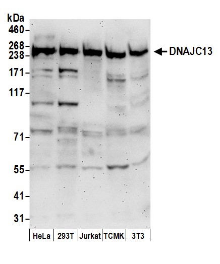 | Immunogen: | synthetic peptide. The epitope recognized by A304-872A-T maps to a region between residue 1175 to 1225 of human DnaJ homolog subfamily C member 13 using the numbering given in entry O75165.5 (GeneID 23317). |