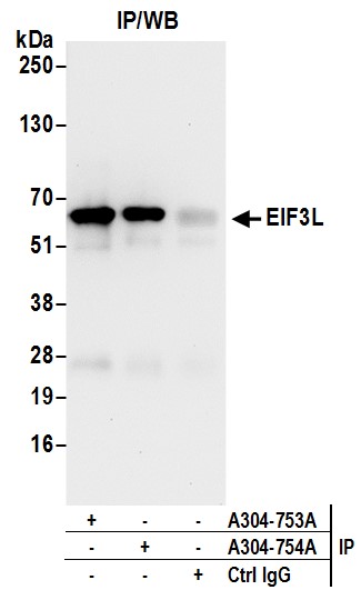 | Immunogen: | synthetic peptide. The epitope recognized by A304-753A-T maps to a region between residue 1 to 50 of human Eukaryotic Translation Initiation Factor 3 Subunit L using the numbering given in entry Q9Y262.1 (GeneID 51386). |
