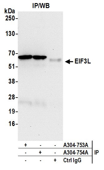| Immunogen: | synthetic peptide. The epitope recognized by A304-754A-T maps to a region between residue 514 to 564 of human Eukaryotic Translation Initiation Factor 3 Subunit L using the numbering given in entry Q9Y262.1 (GeneID 51386). |