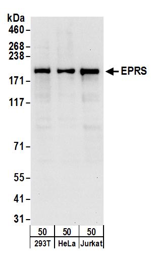 | Immunogen: | synthetic peptide. The epitope recognized by A303-957A-T maps to a region between residue 150 to 200 of human Glutamyl-prolyl-tRNA Synthetase using the numbering given in entry NP_004437.2 (GeneID 2058). |