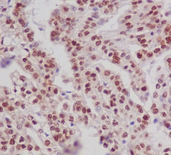 Antibody in PBS with 0.02% sodium azide, 50% glycerol and 0.4-0.5mg/ml BSA. Estrogen receptor alpha is a ligand-activated transcription factor composed of several domains important for hormone binding, DNA binding, and activation of transcription. The protein localizes to the nucleus where it may form a homodimer or a heterodimer with estrogen receptor 2. Estrogen and its receptors are essential for sexual development and reproductive function, but also play a role in other tissues such as bone. [RefSeq] Protein function: Nuclear hormone receptor. The steroid hormones and their receptors are involved in the regulation of eukaryotic gene expression and affect cellular proliferation and differentiation in target tissues. Ligand-dependent nuclear transactivation involves either direct homodimer binding to a palindromic estrogen response element (ERE) sequence or association with other DNA-binding transcription factors, such as AP-1/c-Jun, c-Fos, ATF-2, Sp1 and Sp3, to mediate ERE- independent signaling. Ligand binding induces a conformational change allowing subsequent or combinatorial association with multiprotein coactivator complexes through LXXLL motifs of their respective components. Mutual transrepression occurs between the estrogen receptor (ER) and NF-kappa-B in a cell-type specific manner. Decreases NF-kappa- B DNA-binding activity and inhibits NF-kappa-B-mediated transcription from the IL6 promoter and displace RELA/p65 and associated coregulators from the promoter. Recruited to the NF-kappa-B response element of the CCL2 and IL8 promoters and can displace CREBBP. Present with NF-kappa-B components RELA/p65 and NFKB1/p50 on ERE sequences. Can also act synergistically with NF-kappa-B to activate transcription involving respective recruitment adjacent response elements, the function involves CREBBP. Can activate the transcriptional activity of TFF1. Also mediates membrane-initiated estrogen signaling involving various kinase cascades. Essential for MTA1-mediated transcriptional regulation of BRCA1 and BCAS3 (PubMed:17922032). Maintains neuronal survival in response to ischemic reperfusion injury when in the presence of circulating estradiol (17-beta-estradiol/E2). [The UniProt Consortium]