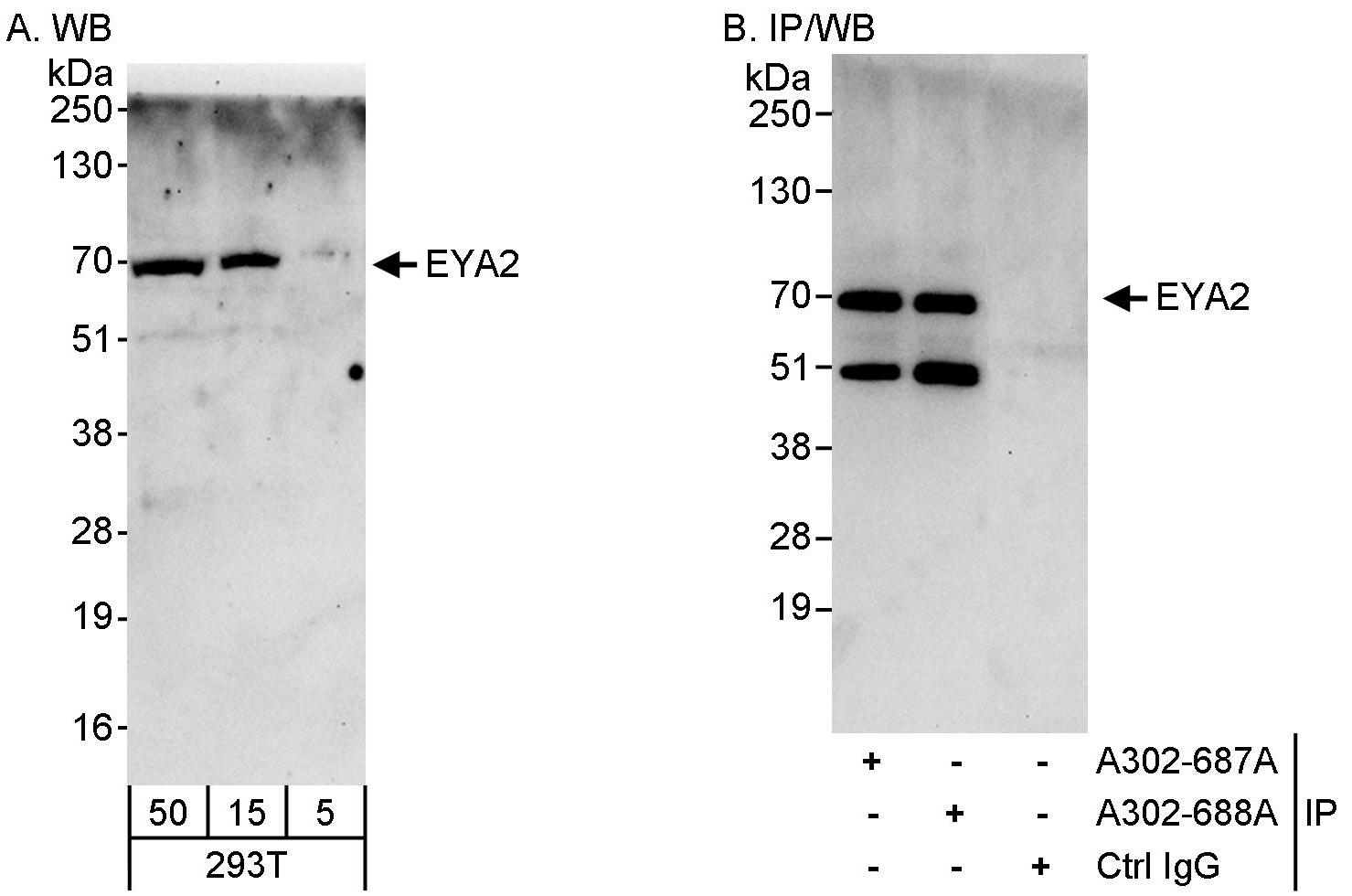 | Immunogen: | synthetic peptide. The epitope recognized by A302-688A-T maps to a region between residue 100 and 150 of human eyes absent homolog 2 using the numbering given in entry NP_005235.3 (GeneID 2139). |