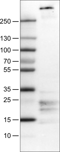 Protein function: [Fibrillin-1]: Structural component of the 10-12 nm diameter microfibrils of the extracellular matrix, which conveys both structural and regulatory properties to load-bearing connective tissues (PubMed:1860873, PubMed:15062093). Fibrillin-1-containing microfibrils provide long-term force bearing structural support. In tissues such as the lung, blood vessels and skin, microfibrils form the periphery of the elastic fiber, acting as a scaffold for the deposition of elastin. In addition, microfibrils can occur as elastin-independent networks in tissues such as the ciliary zonule, tendon, cornea and glomerulus where they provide tensile strength and have anchoring roles. Fibrillin-1 also plays a key role in tissue homeostasis through specific interactions with growth factors, such as the bone morphogenetic proteins (BMPs), growth and differentiation factors (GDFs) and latent transforming growth factor-beta-binding proteins (LTBPs), cell-surface integrins and other extracellular matrix protein and proteoglycan components (PubMed:27026396). Regulates osteoblast maturation by controlling TGF-beta bioavailability and calibrating TGF-beta and BMP levels, respectively. Negatively regulates osteoclastogenesis by binding and sequestering an osteoclast differentiation and activation factor TNFSF11. This leads to disruption of TNFSF11-induced Ca(2+) signaling and impairment of TNFSF11-mediated nuclear translocation and activation of transcription factor NFATC1 which regulates genes important for osteoclast differentiation and function (PubMed:24039232). Mediates cell adhesion via its binding to cell surface receptors integrins ITGAV:ITGB3 and ITGA5:ITGB1 (PubMed:12807887, PubMed:17158881). Binds heparin and this interaction has an important role in the assembly of microfibrils (PubMed:11461921). [The UniProt Consortium] Validated by standard strategies. Buffer: 40% glycerol and PBS (pH 7.2). 0.02% sodium azide is added as preservative. Highest antigen sequence identity to mouse: 89% and to rat: 89%. Epitope specificity: KMQCCCDAGRCWSPG.
