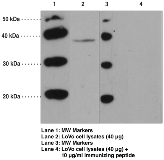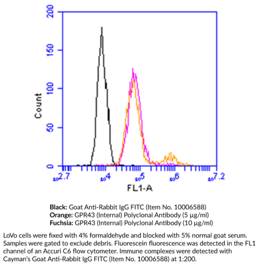 GPR43 is a G protein-coupled receptor activated by short chain fatty acids (SCFAs). Several SCFAs have the potential to bind and activate GPR43, including acetate, formate, propionate, and butyrate. GPR43 couples through the Pertussis toxin-sensitive Gi/o and the pertussis toxin-insensitive Gq protein families and its expression has been described in enteroendocrine cells and neutrophils. The activation of GPR43 induces an increase in intracellular Ca2+, ERK1/2 activation, and a decrease in intracellular cAMP. Activation of GPR43 may be involved in intestinal inflammation. The predicted size of GPR43 is 37 kDa. Cayman's GPR43 (Internal) Polyclonal Antibody detects a 37 kDa band in cell lysates.Synonyms: Free Fatty Acid Receptor 2, G Protein-Coupled Receptor 43. Immunogen: peptide from the internal region of human GPR43. Formulation: (Request formulation change), Peptide affinity-purified IgG lyophilized from TBS, pH 7.4, containing 5 mg/ml BSA. Storage Buffer: TBS, pH 7.4, with 5 mg/ml BSA when reconstituted in 500 µl of deionized. Host: Rabbit. Applications: FC, IF, and WB. UniProt Accession #: O15552.