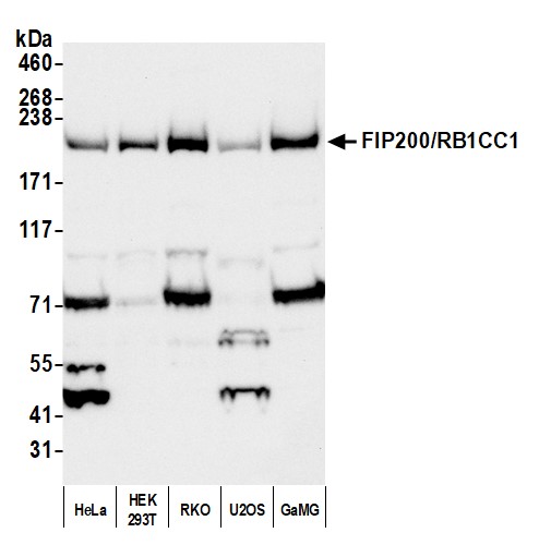 | Keywords: | Anti-FIP200, Anti-RB1CC1, Anti-KIAA0203, Anti-RB1-inducible coiled-coil protein 1, Anti-FAK family kinase-interacting protein of 200 kDa |
