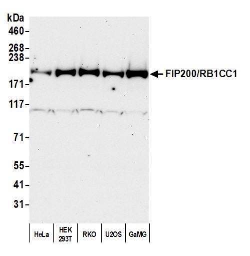 | Keywords: | Anti-FIP200, Anti-RB1CC1, Anti-KIAA0203, Anti-RB1-inducible coiled-coil protein 1, Anti-FAK family kinase-interacting protein of 200 kDa |
