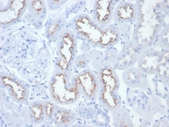 Prediluted in 1X PBS with 0.1 mg/ml BSA (US sourced) and 0.05% sodium azide, *For IHC use only*. Folate hydrolase 1 (FOLH1), also known as Prostate-specific membrane antigen (PSMA), is a type II transmembrane glycoprotein belonging to the M28 peptidase family. FOLH1 has two enzymatic activities, one as a prostate-specific integral membrane folate hydrolase and the other as a carboxypeptidase In the prostate the protein is up-regulated in cancerous cells and is used as an effective diagnostic and prognostic indicator of prostate cancer. Protein function: Has both folate hydrolase and N-acetylated-alpha-linked- acidic dipeptidase (NAALADase) activity. Has a preference for tri- alpha-glutamate peptides. In the intestine, required for the uptake of folate. In the brain, modulates excitatory neurotransmission through the hydrolysis of the neuropeptide, N-aceylaspartylglutamate (NAAG), thereby releasing glutamate. Involved in prostate tumor progression. [The UniProt Consortium]
