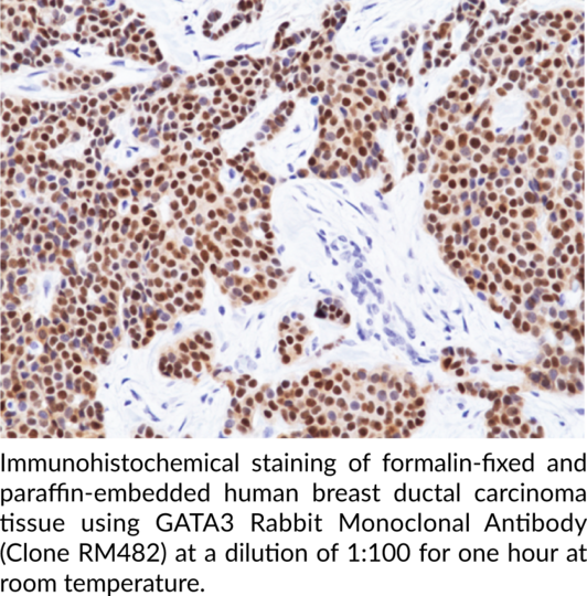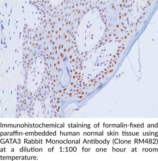 GATA3 is a zinc finger protein and transcription factor with roles in cell differentiation and organogenesis. It is composed of two N-terminal transactivating domains and two C-terminal zinc finger domains. GATA3 is expressed in hematopoietic cells, neurons, adipose tissue, mammary glands, renal tissue, skin, hair, parathyroid glands, and skeletal muscle. It functions as a primary transcription factor in germ cell specification programs and regulates the redistribution of T cell populations from Th2 to Th1 T helper cells. Mutations in GATA3 are associated with the autosomal dominant disorder hypoparathyroidism, sensorineural deafness, and renal dysplasia (HDR) syndrome, also known as Barakat syndrome. GATA3 downregulation is associated with poor prognosis and increased mortality in patients with urothelial malignancies. Cayman's GATA3 Rabbit Monoclonal Antibody (Clone RM482) can be used for immunohistochemistry (IHC) and Western blot (WB) applications.. Cross reactivity: (+) GATA3: . (+) Human: (+) Mouse, (+) Rat.. Protein function: Transcriptional activator which binds to the enhancer of the T-cell receptor alpha and delta genes. Binds to the consensus sequence 5'-AGATAG-3'. Required for the T-helper 2 (Th2) differentiation process following immune and inflammatory responses. [The UniProt Consortium]