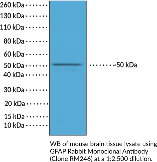 Glial fibrillary acidic protein (GFAP) is a protein encoded by the GFAP gene in humans and a member of the class III intermediate filament (IF) protein family. It is composed of an N-terminal head domain, a highly conserved alpha-helical rod domain, and a C-terminal tail domain that mediate GFAP self-assembly, dimerization, and oligomerization, respectively. GFAP is expressed in, and has commonly been used as a pan marker for, mature astrocytes. GFAP IFs form a dynamic network of cytosolic filament proteins that collectively provide structure and strength to the cytoskeleton of astrocytes, thus supporting their morphology and function. Isolated astrocytes from neonatal Gfap-/- mouse brain have reduced numbers of IFs and IF bundles, increased proliferation, and loss of contact-inhibited growth. Gfap-/- mice develop more diffuse and infiltrative brain lesions compared to wild-type littermates in a mouse model of experimental autoimmune encephalomyelitis (EAE). Mutations in the rod and tail domains of GFAP have been associated with Rosenthal fiber formation, a hallmark of Alexander disease. Transgenic overexpression of Gfap in mice increases the expression of certain cytokines and antioxidative enzymes in the olfactory bulb and has been used as a mouse model of Alexander disease. GFAP can be citrullinated on the arginine residue at position 270 (R270) and at R416 by protein arginine deiminase 1 (PAD1, Cay-10784) and PAD2 (Cay-10785). Citrullinated GFAP has been found in rat cerebral cortex in a model of traumatic brain injury, as well as in postmortem hippocampus from patients with Alzheimer's disease. Cayman's GFAP Rabbit Monoclonal Antibody (Clone RM246) can be used for immunohistochemistry (IHC) and Western blot (WB) applications. The antibody recognizes GFAP at approximately 50 kDa from human and mouse samples.. Protein function: GFAP, a class-III intermediate filament, is a cell-specific marker that, during the development of the central nervous system, distinguishes astrocytes from other glial cells. [The UniProt Consortium]