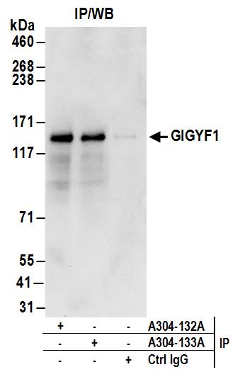 | Immunogen: | synthetic peptide. The epitope recognized by A304-132A-T maps to a region between residue 350 to 400 of human GRB10 Interacting GYF Protein 1 using the numbering given in entry NP_072096.2 (GeneID 64599). |