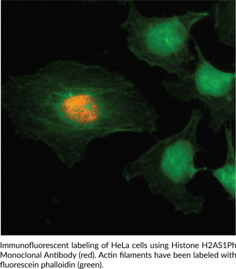Histone H2A is a nuclear protein and a component of the nucleosome core, a basic unit of chromatin, that is essential for organizing genomic DNA in eukaryotic nuclei. Histones are globular proteins with unstructured N-terminal tails and are subject to a variety of post-translational modifications, such as methylation, acetylation, phosphorylation, and citrullination, that can influence chromatin structure and regulate gene transcription. Phosphorylation of histone H2A at serine 1 (H2AS1Ph) is mediated by p90 ribosomal S6 kinase 5 (RSK5) and is associated with transcriptional repression. H2AS1Ph is enriched during mitosis in C. elegans, Drosophila, and HeLa cells, as well as during meiotic recombination in mouse spermatozoa. Cayman's Histone H2AS1Ph Monoclonal Antibody (RM216) can be used for ELISA, immunocytochemistry (ICC), multiplex-based assay, and Western blot (WB) applications. This antibody is cross-reactive with histone H4 phosphorylated at serine 1 (H4S1Ph).Synonyms: H2ApS1, H2ApSer1, H2A (Phospho-Ser1), Phospho-Histone H2A Serine 1, Phosphorylated Histone H2A Serine 1. Immunogen: Peptide corresponding to H2AS1Ph. Clone Designation: RM216. Formulation: (Request formulation change), 100 µg of protein A-affinity purified monoclonal antibody. Storage Buffer: PBS with 50% glycerol, 1% BSA, and 0.09% sodium azide. Host: Rabbit. Isotype: IgG. Applications: ELISA, ICC, multiplex-based assays, WB. Cross Reactivity: (+) H2AS1Ph, (+) H4S1Ph, (-) Unmodified H2AS1, (-) Unmodified H4S1.