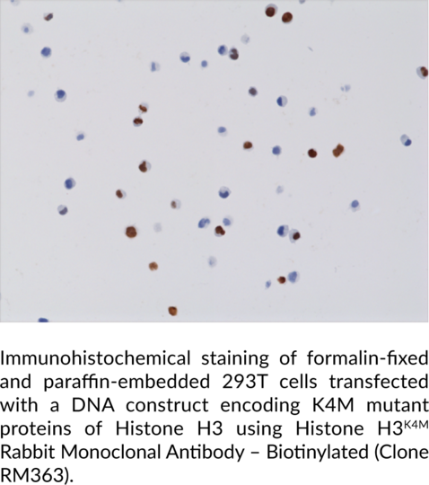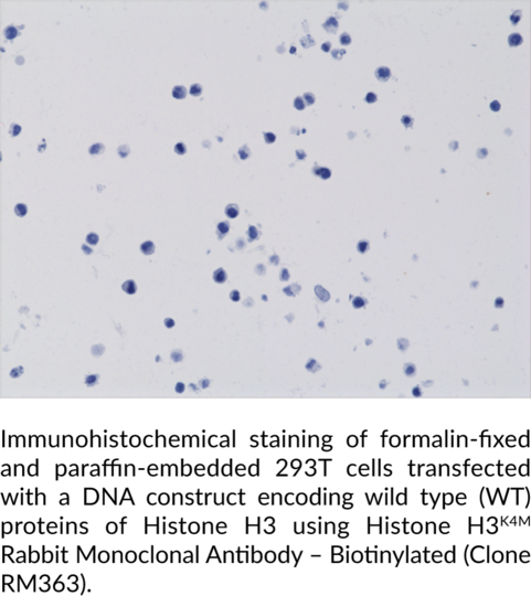 Histone 3 is a nuclear protein and a component of the nucleosome core, a basic unit of chromatin, that is essential for organizing genomic DNA in eukaryotic nuclei. It is a globular protein that contains a histone fold domain with a C-terminal alpha-helix that facilitates nucleosome interactions and chromatin compaction, as well as an unstructured N-terminal tail that extends outside of the nucleosome core, both of which are subject to various post-translational modifications (PTMs), including ubiquitination, acetylation, methylation, and phosphorylation. Histone H3 has a key role in transcriptional regulation. Expression of histone H3. a subtype of histone 3, containing a lysine-to-methionine substitution at residue 4 (H3.3K4M) decreases the levels of histone H3K4Me1 and H3K4Me3 in primary mouse cortical neurons. Cayman's Histone H3 K4M Mutant Rabbit Monoclonal Antibody - Biotinylated (Clone RM363) can be used for ELISA, immunohistochemistry (IHC), and Western blot (WB) applications.. Cross reactivity: (+) Histone H3K4M: (-) Histone H3.. Protein function: Variant histone H3 which replaces conventional H3 in a wide range of nucleosomes in active genes. Constitutes the predominant form of histone H3 in non-dividing cells and is incorporated into chromatin independently of DNA synthesis. Deposited at sites of nucleosomal displacement throughout transcribed genes, suggesting that it represents an epigenetic imprint of transcriptionally active chromatin. Nucleosomes wrap and compact DNA into chromatin, limiting DNA accessibility to the cellular machineries which require DNA as a template. Histones thereby play a central role in transcription regulation, DNA repair, DNA replication and chromosomal stability. DNA accessibility is regulated via a complex set of post-translational modifications of histones, also called histone code, and nucleosome remodeling. [The UniProt Consortium]