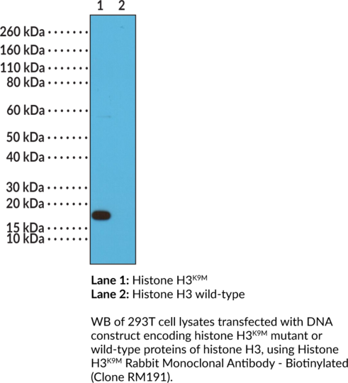 Histone 3 is a nuclear protein and a component of the nucleosome core, a basic unit of chromatin, that is essential for organizing genomic DNA in eukaryotic nuclei. It is a globular protein that contains a histone fold domain with a C-terminal alpha-helix that facilitates nucleosome interactions and chromatin compaction, as well as an unstructured N-terminal tail that extends outside of the nucleosome core, both of which are subject to various post-translational modifications (PTMs), including ubiquitination, acetylation, methylation, and phosphorylation. Histone H3 has a key role in transcriptional regulation. In vitro, expression of histone H3 containing a lysine-to-methionine substitution at residue 9 (H3K9M) reduces histone H3K9 methylation and inhibits heterochromatin expansion. Cayman's Histone H3K9M Rabbit Monoclonal Antibody - Biotinylated (Clone RM191) can be used for ELISA, immunohistochemistry (IHC), and Western blot (WB) applications.. Cross reactivity: (+) Histone H3K9M: (-) Histone H3.. Protein function: Variant histone H3 which replaces conventional H3 in a wide range of nucleosomes in active genes. Constitutes the predominant form of histone H3 in non-dividing cells and is incorporated into chromatin independently of DNA synthesis. Deposited at sites of nucleosomal displacement throughout transcribed genes, suggesting that it represents an epigenetic imprint of transcriptionally active chromatin. Nucleosomes wrap and compact DNA into chromatin, limiting DNA accessibility to the cellular machineries which require DNA as a template. Histones thereby play a central role in transcription regulation, DNA repair, DNA replication and chromosomal stability. DNA accessibility is regulated via a complex set of post-translational modifications of histones, also called histone code, and nucleosome remodeling. [The UniProt Consortium]