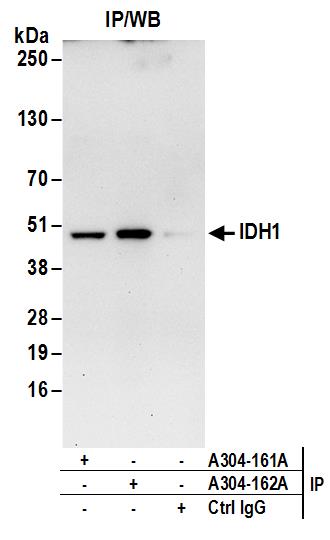 | Immunogen: | synthetic peptide. The epitope recognized by A304-162A-T maps to a region between residue 364 to 414 of human Isocitrate Dehydrogenase 1 using the numbering given in entry NP_005887.2 (GeneID 3417). |