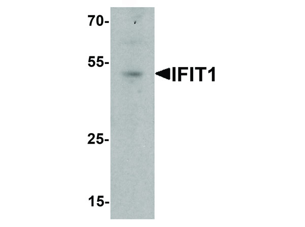 Anti-IFIT1 antibody was affinity purified from monospecific antiserum by immunoaffinity chromatography. IFIT1 antibody is human, mouse and rat reactive. At least three isoforms of IFIT1 are known to exist. This antibody is predicted to not cross-react with other members of the IFIT protein family. Protein function: Interferon-induced antiviral RNA-binding protein that specifically binds single-stranded RNA bearing a 5'-triphosphate group (PPP-RNA), thereby acting as a sensor of viral single- stranded RNAs and inhibiting expression of viral messenger RNAs. Single-stranded PPP-RNAs, which lack 2'-O-methylation of the 5' cap and bear a 5'-triphosphate group instead, are specific from viruses, providing a molecular signature to distinguish between self and non-self mRNAs by the host during viral infection. Directly binds PPP-RNA in a non-sequence-specific manner. Viruses evolved several ways to evade this restriction system such as encoding their own 2'-O-methylase for their mRNAs or by stealing host cap containing the 2'-O-methylation (cap snatching mechanism). Exhibits antiviral activity against several viruses including human papilloma and hepatitis C viruses. [The UniProt Consortium]