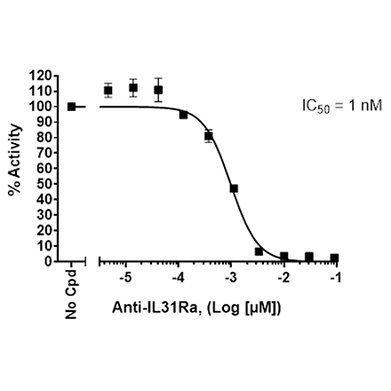 Recombinant anti-IL-31Ra (interleukin 31 receptor subunit alpha) antibody recognizing human IL-31Ra protein. This anti-IL-31Ra antibody is a purified, humanized recombinant monoclonal antibody. This antibody has been tested in a binding assay. It is similar to Nemolizumab. IL-31 (interleukin 31) is a four-helix bundle proinflammatory cytokine preferentially produced by T helper type 2 (TH2) cells. IL-31 regulates cell differentiation, cell proliferation, and immune responses, serving as a neuroimmune link between TH2 cells and sensory neurons in generating a T cell-mediated inflammatory itch. The IL-31 receptor complex, composed of IL-31RA and OSMR (human oncostatin M receptor beta), is expressed by various epithelial and immune cells as well as dorsal root ganglia sensory neurons. IL-31 interacts with the IL-31 receptor complex, activating Janus kinases JAK1 and JAK2. This activation leads to the phosphorylation of signal transducer and activator of transcription (STAT) molecules, mainly STAT3, which upregulate the genes responsible for the IL-31 induced itch sensation. Often referred to as the itchy cytokine, increased expression of IL-31 or its receptor IL-31RA is correlated with alopecia, skin lesions, airway hypersensitivity, and particularly pruritic disorders such as atopic dermatitis. IL-31 and other TH2 related cytokines (including IL-4, IL-13 and TSLP (thymic stromal lymphopoietin) play an important role in the pathogenesis of a variety of inflammatory and allergic diseases and have become popular for therapeutic development. The IL-31RA targeting antibody Nemolizumab has been FDA-approved for the treatment of atopic dermatitis.