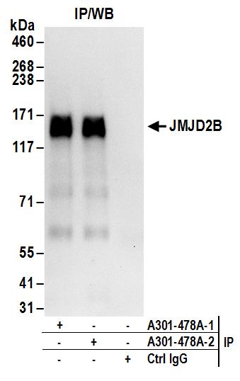 | Immunogen: | synthetic peptide. The epitope recognized by A301-478A-T maps to a region between residue 1056 and 1096 of human jumonji domain containing 2B using the numbering given in entry NP_055830.1 (GeneID 23030). |