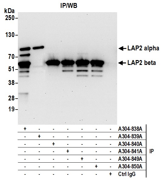 | Immunogen: | synthetic peptide. The epitope recognized by A304-838A-T maps to a region between residue 1 to 50 of human LAP2 alpha beta gamma/TMPO using the numbering given in entry P42166 (GeneID 7112). |