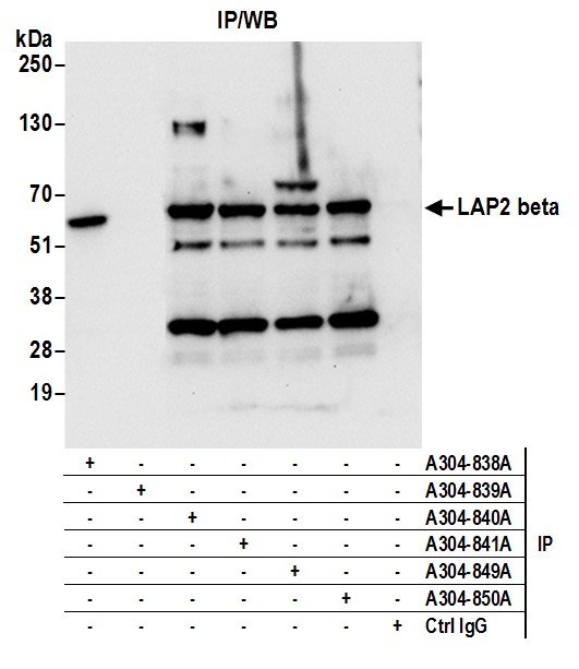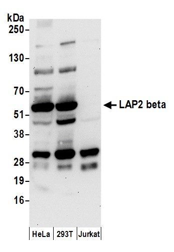 | Immunogen: | synthetic peptide. The epitope recognized by A304-840A-T maps to a region between residue 225 to 275 of human LAP2 beta/TMPO using the numbering given in entry P42166 (GeneID 7112). |