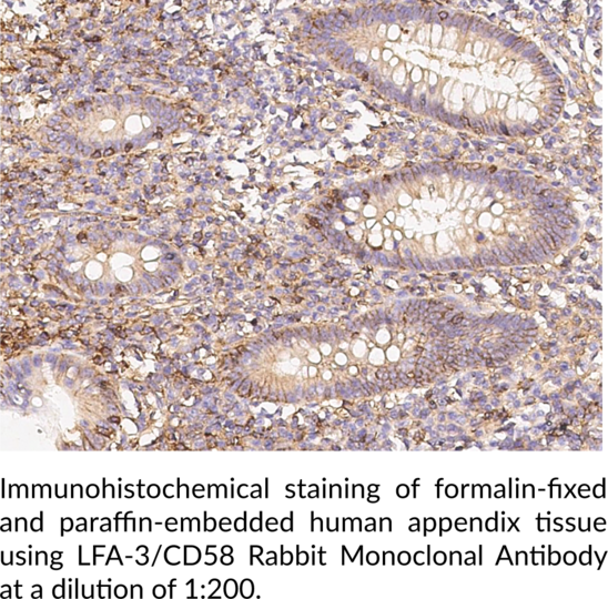 Lymphocyte function-associated antigen 3 (LFA-3), also known as CD58, is a membrane-associated glycoprotein. It exists as two isoforms: a type I transmembrane glycoprotein involved in signal transduction and a glycosylphosphatidylinositol-anchored (GPI-anchored) form primarily involved in cell adhesion. A soluble form of LFA-3, sCD58, also exists. Transmembrane LFA-3 is composed of an N-terminal extracellular domain containing N-linked glycosylation sites, a transmembrane domain, and a short C-terminal cytoplasmic tail. The GPI-anchored form is located extracellularly and is linked to the plasma membrane via the C-terminus. LFA-3 is expressed broadly on hematopoietic and non-hematopoietic cells and its ligand, CD2, is expressed on T cells, natural killer (NK) cells, thymocytes, and certain bone marrow cells. LFA-3 acts as a co-stimulatory receptor that, when bound by CD2 on the surface of T cells, is part of the immunological synapse and induces T cell activation. It is also involved in thymocyte development and NK cell communication, as well as other immune and non-immune functions. sCD58 disrupts cell-cell adhesion and has immunosuppressive effects. Various SNPs in CD58 are associated with an increased risk of multiple sclerosis with one SNP potentially conferring a protective effect. The expression of CD58 is increased or decreased in various cancers with increased expression positively correlated with overall survival and disease-free survival in patients with acute myeloid leukemia (AML). Cayman's LFA-3/CD58 Rabbit Monoclonal Antibody (Clone 126) can be used for immunohistochemistry paraffin (IHC-P).Synonyms: Ag3, Lymphocyte Function Antigen 3, Lymphocyte Function-associated Antigen 3, Surface Glycoprotein LFA-3. Immunogen: Recombinant human LFA-3/CD58. Clone Designation: 126. Formulation: (Request formulation change), 50 or 100 µl of protein A-purified monoclonal antibody. Storage Buffer: 0.2 µm filtered solution in PBS. Host: Rabbit. Isotype: IgG. Applications: IHC-P. Cross Reactivity: (+) CD58.