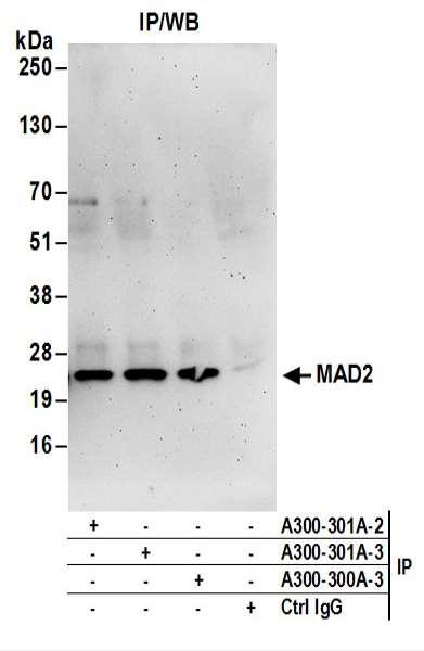 | Immunogen: | synthetic peptide. The epitope recognized by A300-301A-T maps to a region between residue 150 and the C-terminus (residue 205) of human Mitotic Arrest Deficient 2 using the numbering given in SwissProt entry Q13257 (GeneID 4085). |