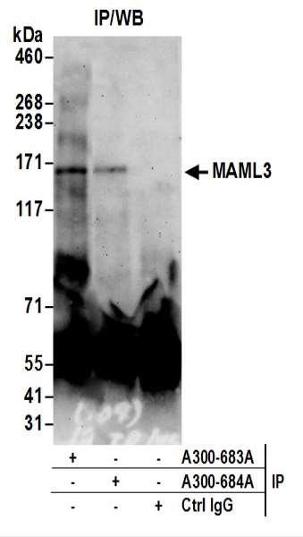 | Immunogen: | synthetic peptide. The epitope recognized by A300-683A maps to a region between residue 150 and 200 of human Mastermind-Like 3 using the numbering given in entry NP_061187.2 (GeneID 55534). |