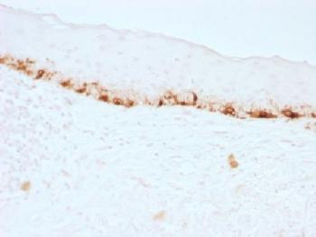 0.2 mg/ml with 0.1 mg/ml BSA (US sourced), 0.05% sodium azide. This antibody recognizes a protein doublet of 20-22kDa, identified as MART-1 (Melanoma Antigen Recognized by T cells 1) or Melan-A. MART-1 is a melanocyte differentiation antigen recognized by autologous cytotoxic T lymphocytes. There are seven other melanoma associated antigens recognized by autologous cytotoxic T cells: MAGE-1, MAGE-3, tyrosinase, gp100, gp75, BAGE-1, and GAGE-1. Subcellular fractionation shows that MART-1 is present in melanosomes and endoplasmic reticulum. This MART-1 antibody labels melanomas and other tumors showing melanocytic differentiation. It is also a useful positive-marker for angiomyolipomas. The antibody does not stain tumor cells of epithelial, lymphoid, glial, or mesenchymal origin. Protein function: Involved in melanosome biogenesis by ensuring the stability of GPR143. Plays a vital role in the expression, stability, trafficking, and processing of melanocyte protein PMEL, which is critical to the formation of stage II melanosomes. [The UniProt Consortium]