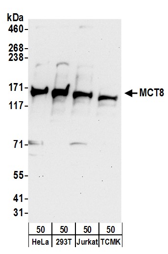 | Immunogen: | synthetic peptide. The epitope recognized by A304-351A-T maps to a region between residue 250 to 300 of human Monocarboxylate Transporter 8 using the numbering given in entry NP_006508.2 (GeneID 6567). |