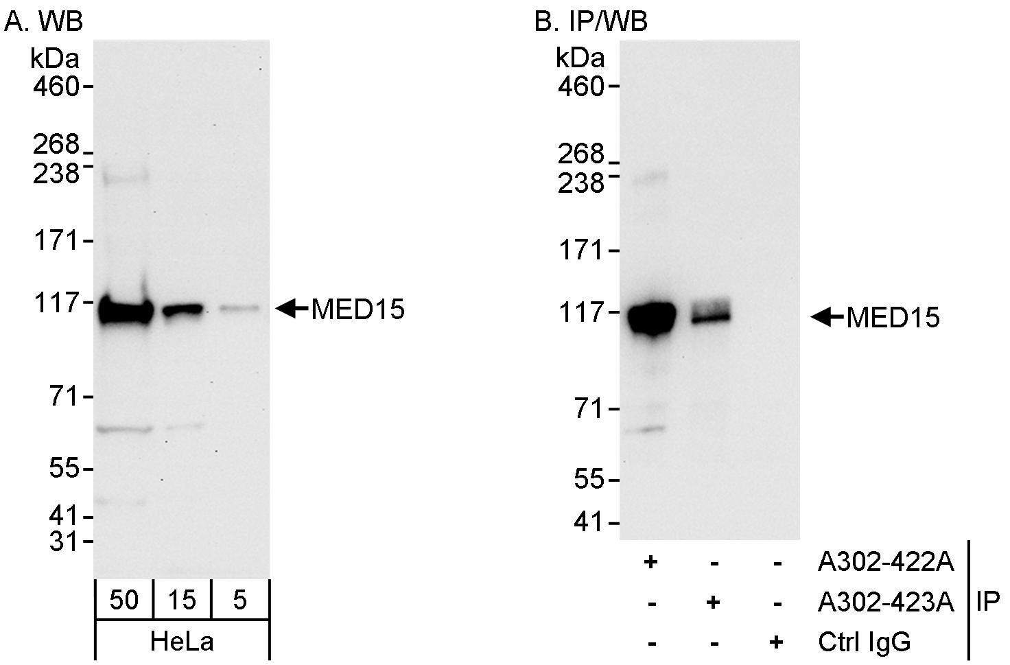 | Immunogen: | synthetic peptide. The epitope recognized by A302-422A-T maps to a region between residue 450 and 500 of human mediator complex subunit 15 using the numbering given in entry NP_001003891.1 (GeneID 51586). |