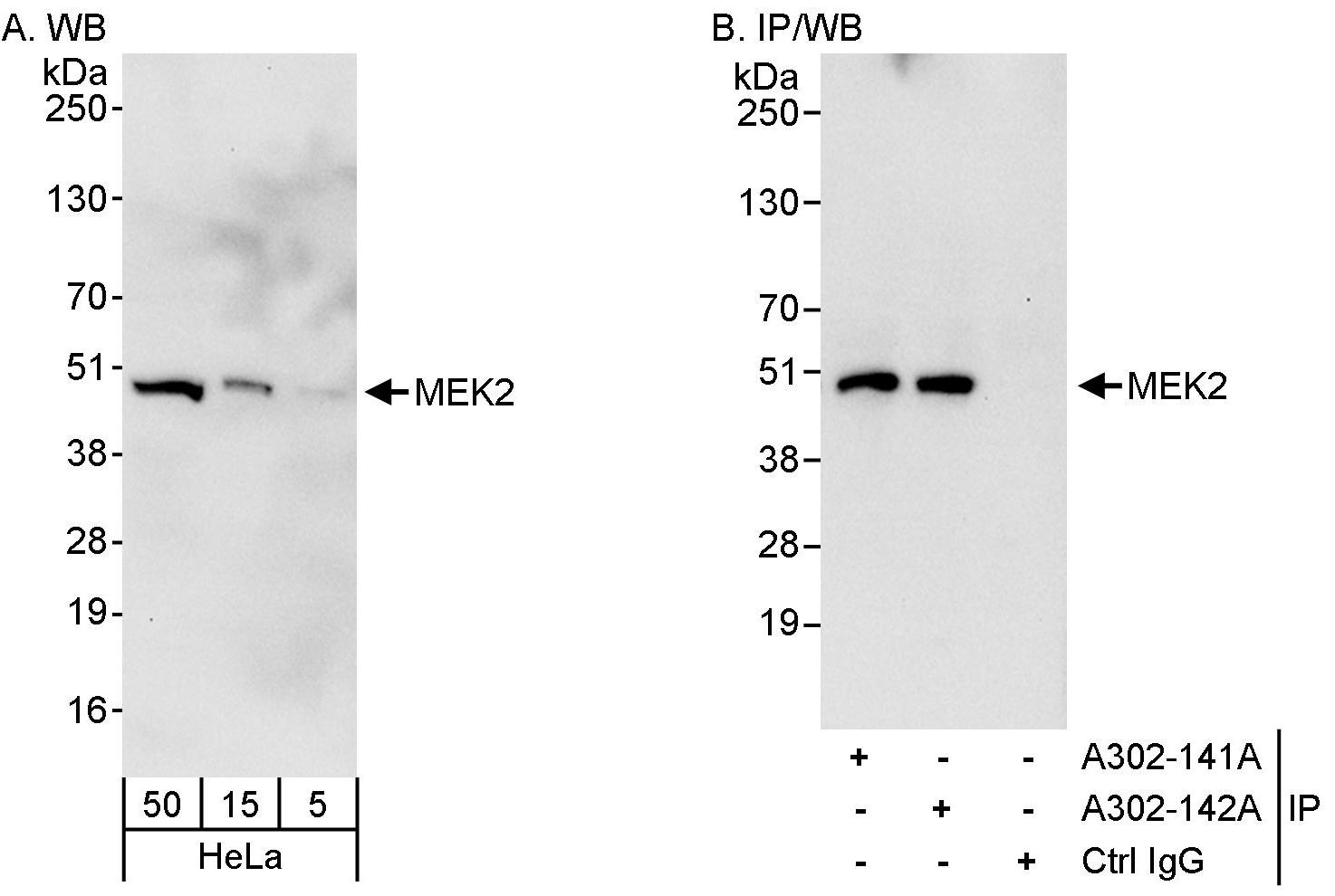 Immunogen: synthetic peptide. The epitope recognized by A302-141A-T maps to a region between residue 1 and 50 of human MAPK/ERK kinase 2 using the numbering given in entry NP_109587.1 (GeneID 5605).