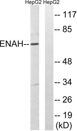 This gene encodes a member of the enabled/ vasodilator-stimulated phosphoprotein. Members of this gene family are involved in actin-based motility. This protein is involved in regulating the assembly of actin filaments and modulates cell adhesion and motility. Alternate splice variants of this gene have been correlated with tumor invasiveness in certain tissues and these variants may serve as prognostic markers. A pseudogene of this gene is found on chromosome 3. [provided by RefSeq, Sep 2016], Protein function: Ena/VASP proteins are actin-associated proteins involved in a range of processes dependent on cytoskeleton remodeling and cell polarity such as axon guidance and lamellipodial and filopodial dynamics in migrating cells. ENAH induces the formation of F-actin rich outgrowths in fibroblasts. Acts synergistically with BAIAP2-alpha and downstream of NTN1 to promote filipodia formation. [The UniProt Consortium] Recommended dilutions: Western Blot: 1/500 - 1/2000. Immunohistochemistry: 1/100 - 1/300. ELISA: 1/10000. Not yet tested in other applications.. Cellular localization: Cytoplasm. Cytoplasm, cytoskeleton . Cell projection, lamellipodium . Cell projection, filopodium . Cell junction, synapse . Cell junction, focal adhesion. Targeted to the leading edge of lamellipodia and filopodia by MRL family members. Colocalizes at filopodial tips with a number of other proteins including vinculin and zyxlin. Colocalizes with N-WASP at the leading edge. Colocalizes with GPHN and PFN at synapses (By similarity). .