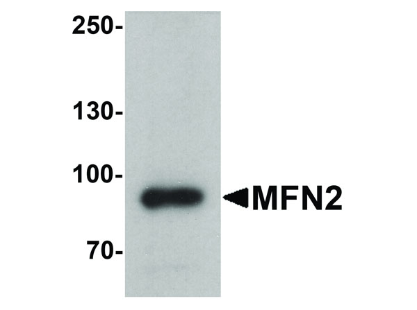 Anti-MFN2 antibody was affinity purified from monospecific antiserum by immunoaffinity chromatography. MFN2 antibody is human, mouse and rat reactive. At least three isoforms of MFN2 are known to exist. MFN2 antibody is predicted to not cross-react with MFN1. Protein function: Essential transmembrane GTPase, which mediates mitochondrial fusion. Fusion of mitochondria occurs in many cell types and constitutes an important step in mitochondria morphology, which is balanced between fusion and fission. MFN2 acts independently of the cytoskeleton. It therefore plays a central role in mitochondrial metabolism and may be associated with obesity and/or apoptosis processes. Overexpression induces the formation of mitochondrial networks. Plays an important role in the regulation of vascular smooth muscle cell proliferation. Involved in the clearance of damaged mitochondria via selective autophagy (mitophagy). Is required for PARK2 recruitment to dysfunctional mitochondria. Involved in the control of unfolded protein response (UPR) upon ER stress including activation of apoptosis and autophagy during ER stress. Acts as an upstream regulator of EIF2AK3 and suppresses EIF2AK3 activation under basal conditions. [The UniProt Consortium]