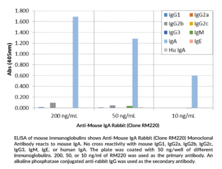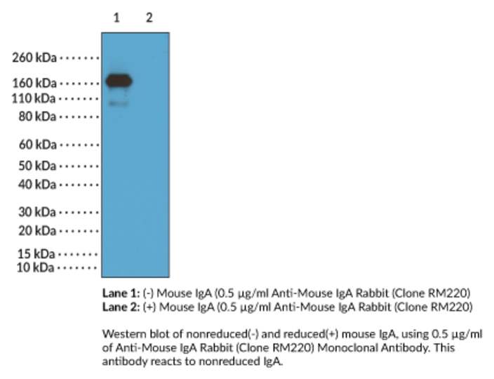 Immunoglobulin A (IgA) is a member of the immunoglobulin superfamily of glycoproteins with roles in host defense against intestinal pathogens and both quantitative and qualitative control of host commensal microbiota composition. It is produced by B cells and later secreted by plasma cells and is the most abundant antibody on mucosal surfaces that comprises at least 70% of all Ig produced in mice. Mouse IgA consists of two heavy chains of approximately 53.5 kDa each and two light chains of approximately 25 kDa each. Unlike human IgA, mouse IgA exists as a single isotype and is primarily found as a dimer that lacks the disulfide bonds between the light and heavy chains present in other Ig classes. Production of IgA is induced in the gut only in animals containing intestinal microbes, and the number of IgA-producing plasma cells is reduced in germ-free mice. IgA-deficient mice exhibit increased lethality compared with wild-type mice in a model of influenza infection, as well as reduced bacterial clearance in a model of G. muris infection. However, IgA deficiency does not affect clearance of vaginal infection with herpes simplex virus 2 (HSV-2), indicating redundancy in pathogen protection with compensation by antibodies of other isotypes or innate immune mechanisms at mucosal surfaces. Cayman's IgA (mouse) Monoclonal Antibody (Clone RM220) can be used for ELISA and Western blot (WB, non-reducing conditions) applications. The antibody recognizes IgA at approximately 160 kDa from mouse samples.Immunogen: Mouse IgA. Clone Designation: RM220. Formulation: (Request formulation change), 100 µg of protein A-affinity purified monoclonal antibody. Storage Buffer: PBS with 50% glycerol, 1% BSA, and 0.09% sodium azide. Host: Rabbit. Isotype: IgG. Applications: ELISA, WB (non-reducing conditions). Cross Reactivity: (-) Human IgA, (-) Mouse IgG1, (-) Mouse IgG2a, (-) Mouse IgG2b, (-) Mouse IgG2c, (-) Mouse IgG3, (-) Mouse IgE, (-) Mouse IgM.