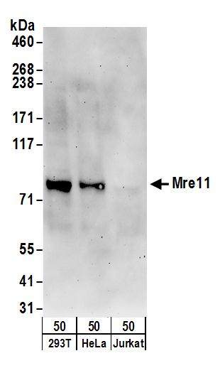 | Immunogen: | synthetic peptide. The epitope recognized by A303-998A-T maps to a region between residue 658 to 708 of human Meiotic Recombination 11 using the numbering given in entry NP_005582.1 (GeneID 4361). |