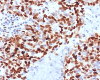Prediluted in 1X PBS with 0.1 mg/ml BSA (US sourced) and 0.05% sodium azide, *For IHC use only*. MSH6 is a component of the post-replicative DNA mismatch repair system (MMR). Heterodimerizes with MSH2 to form MutS alpha, which binds to DNA mismatches thereby initiating DNA repair. When bound, MutS alpha bends the DNA helix and shields approximately 20 base pairs, and recognizes single base mismatches and dinucleotide insertion-deletion loops (IDL) in the DNA. After mismatch binding, forms a ternary complex with the MutL alpha heterodimer, which is thought to be responsible for directing the downstream MMR events, including strand discrimination, excision, and resynthesis. [UniProt] Protein function: Component of the post-replicative DNA mismatch repair system (MMR). Heterodimerizes with MSH2 to form MutS alpha, which binds to DNA mismatches thereby initiating DNA repair. When bound, MutS alpha bends the DNA helix and shields approximately 20 base pairs, and recognizes single base mismatches and dinucleotide insertion-deletion loops (IDL) in the DNA. After mismatch binding, forms a ternary complex with the MutL alpha heterodimer, which is thought to be responsible for directing the downstream MMR events, including strand discrimination, excision, and resynthesis. ATP binding and hydrolysis play a pivotal role in mismatch repair functions. The ATPase activity associated with MutS alpha regulates binding similar to a molecular switch: mismatched DNA provokes ADP-->ATP exchange, resulting in a discernible conformational transition that converts MutS alpha into a sliding clamp capable of hydrolysis-independent diffusion along the DNA backbone. This transition is crucial for mismatch repair. MutS alpha may also play a role in DNA homologous recombination repair. Recruited on chromatin in G1 and early S phase via its PWWP domain that specifically binds trimethylated 'Lys-36' of histone H3 (H3K36me3): early recruitment to chromatin to be replicated allowing a quick identification of mismatch repair to initiate the DNA mismatch repair reaction. [The UniProt Consortium]