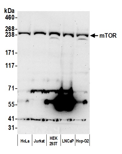 | Immunogen: | synthetic peptide. The epitope recognized by A300-503A-T maps to a region between residue 200 and 250 of human Mammalian Target of Rapamycin using the numbering given in entry NP_004949.1 (GeneID 2475). |