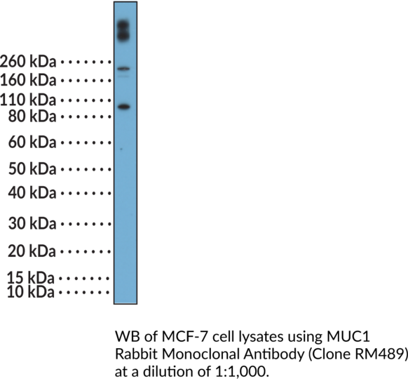 Mucin 1 (MUC1) is a member of the mucin family. It is expressed as a proprotein that is cleaved into extracellular and transmembrane polypeptides. The extracellular polypeptide is composed of a tandem repeat domain, which contains O- and N-linked glycosylation sites, and is attached non-covalently to the transmembrane polypeptide, which is composed of a juxtamembrane region, a transmembrane domain, and a C-terminal cytoplasmic tail. MUC1 is ubiquitously expressed in tissues, such as stomach peptic cells, organ endothelium and epithelium, and liver bile ducts, and functions as an extracellular barrier, serves as an anchor for intercellular proteins, such as intercellular adhesion molecule-1 (ICAM-1), or associates with other receptors, such as EGFR, to assist in signal transduction. MUC1 can undergo alternative splicing to produce secreted or intracellular MUC1 isoforms. In tumors, MUC1 prevents immune cell recognition and engagement, increases metastatic potential, and is frequently overexpressed in cancers. Serum and tumor levels of MUC1 are increased in patients with breast cancer. Cayman's MUC1 Rabbit Monoclonal Antibody (Clone RM489) can be used for immunohistochemistry (IHC) and Western blot (WB) applications.. Cross reactivity: (+) MUC1: . (+) Human: .. Protein function: The alpha subunit has cell adhesive properties. Can act both as an adhesion and an anti-adhesion protein. May provide a protective layer on epithelial cells against bacterial and enzyme attack. [The UniProt Consortium]