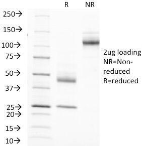 Prediluted in 1X PBS, 0.1 mg/ml BSA (US sourced), 0.05% sodium azide, *For IHC use only*. This antibody recognizes proteins in MW range of 265-400kDa, identified as different glycoforms of MUC1 (Mucin-1) or EMA (epithelial membrane antigen). The alpha subunit has cell adhesive properties. It can act both as an adhesion and an anti-adhesion protein. MUC1 / Mucin-1 may provide a protective layer on epithelial cells against bacterial and enzyme attack. The beta subunit contains a C-terminal domain, which is involved in cell signaling through phosphorylations and protein-protein interactions. In immunohistochemical assays, the MUC1 / EMA antibody superbly stains routine formalin/paraffin carcinoma tissues. MUC1 antibody is useful as a pan-epithelial marker for detecting early metastatic loci of carcinoma in bone marrow or liver. Protein function: The alpha subunit has cell adhesive properties. Can act both as an adhesion and an anti-adhesion protein. May provide a protective layer on epithelial cells against bacterial and enzyme attack. [The UniProt Consortium]