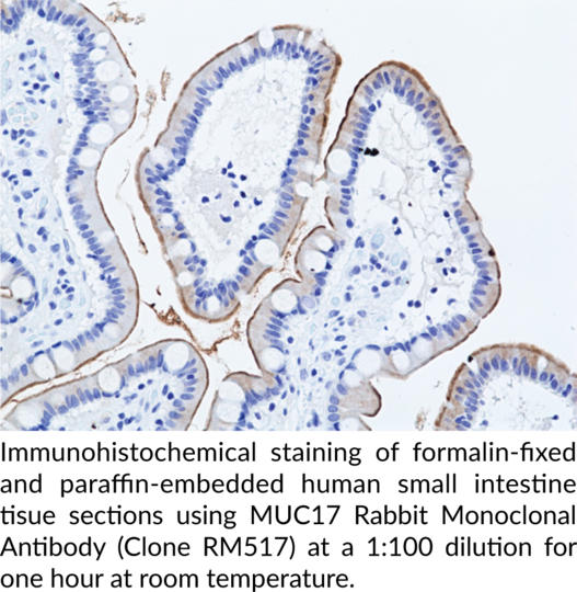 Mucin 17 (MUC17) is a member of the mucin family. It is composed of an N-terminal tandem repeat domain, which contains O- and N-linked glycosylation sites, two EGF-like domains, a SEA module, a transmembrane region, and a short C-terminal cytoplasmic domain. MUC17 is alternatively expressed as a membrane-bound- or secreted protein. Membrane-bound MUC17 is predominantly expressed in the small intestine and colon by absorptive epithelial cells. The levels of MUC17 are increased in tumor tissue from patients with colon adenocarcinoma. Cayman's MUC17 Rabbit Monoclonal Antibody (Clone RM517) can be used for immunohistochemistry (IHC).. Protein function: Probably plays a role in maintaining homeostasis on mucosal surfaces. [The UniProt Consortium]