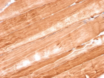 Prediluted in 1X PBS with 0.1 mg/ml BSA (US sourced) and 0.05% sodium azide, *For IHC use only*. Myoglobin is a cytosolic oxygen-binding protein responsible for the storage and diffusion of oxygen within myocytes. Expression of myoglobin is highest in skeletal and cardiac muscle. Myoglobin is well accepted as an O2-storage protein in muscle, capable of releasing O2 during periods of hypoxia or anoxia. In combination with other striated muscle markers such as vimentin and myogenin, myoglobin is helpful in the identification of rhabdomyosarcoma and tumors with skeletal muscle differentiation. Reportedly, myoglobin is expressed on epithelial cancer cells due to changed metabolic and environmental conditions. Protein function: Serves as a reserve supply of oxygen and facilitates the movement of oxygen within muscles. [The UniProt Consortium]