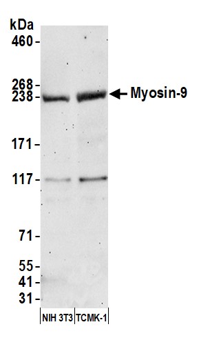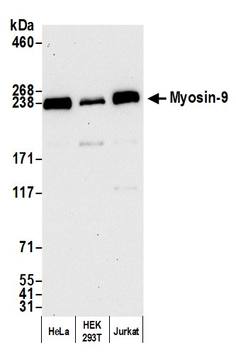 Immunogen: synthetic peptide. The epitope recognized by A304-490A-T maps to a region between residue 1900 to 1950 of human Myosin Heavy Chain 9 using the numbering given in entry NP_002464.1 (GeneID 4627).