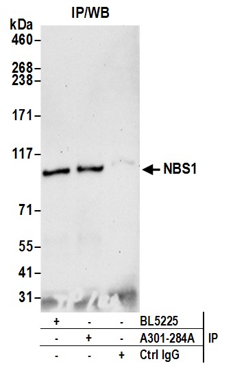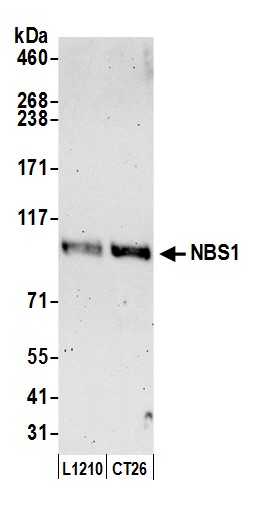 | Immunogen: | synthetic peptide. The epitope recognized by A301-284A-T maps to a region between residue 701 and 751 of mouse Nibrin using the numbering given in entry NP_038780.3 (GeneID 27354). |