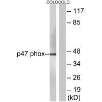 Host Species: Rabbit. Isotype: IgG. Buffer: Rabbit IgG in phosphate buffered saline (without Mg2+ and Ca2+), pH 7.4, 150mM NaCl, 0.02% sodium azide and 50% glycerol. Storage: Upon receipt, store at -20°C or -80°C. Avoid repeated freeze. Purification Method: The antibody was affinity-purified from rabbit antiserum by affinity-chromatography using epitope-specific immunogen. Target Name: NCF1. Antigen Species: Human
