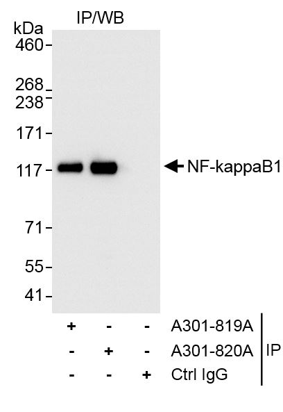 | Immunogen: | synthetic peptide. The epitope recognized by A301-820A-T maps to a region between residue 918 and 968 of human nuclear factor of kappa light polypeptide gene enhancer in B-cells 1 (p105) using the numbering given in entry AAF35232.1 (GeneID 4790). |